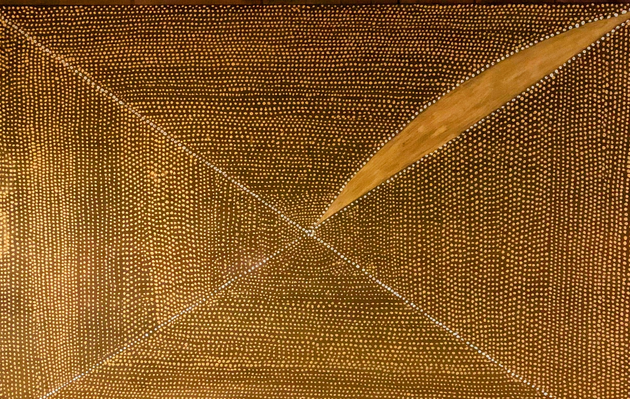 Une danse de points dorés s’étend sur la toile, rappelant les paysages arides et les sentiers ancestraux. Les lignes diagonales suggèrent un mouvement, un chemin spirituel, tandis que la texture rythmée des points évoque la mémoire des histoires racontées autour du feu. Une harmonie subtile entre lumière et espace transporte le spectateur dans un voyage au cœur de la tradition aborigène, où chaque point a sa voix et chaque couleur, son sens.